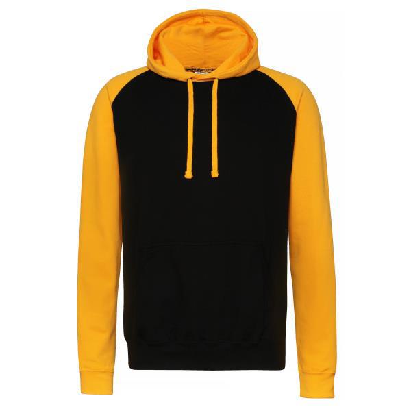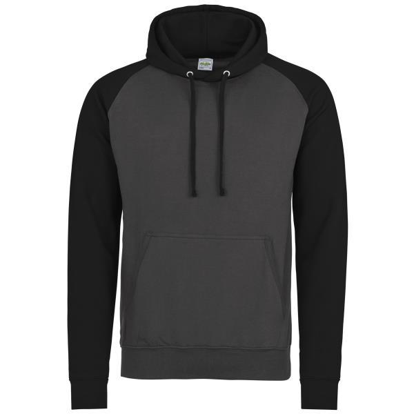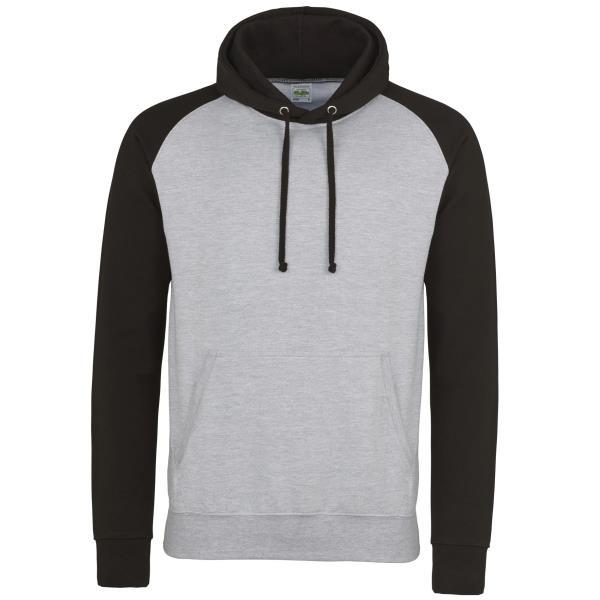 Sporty baseball hoodie with contrasting sleeves and hood.