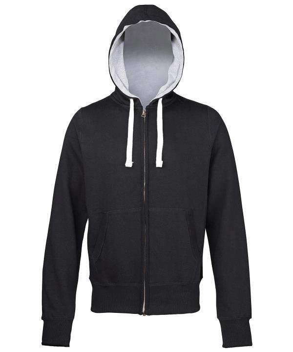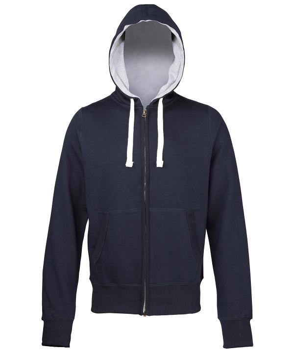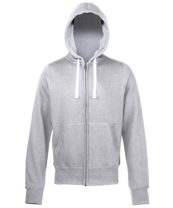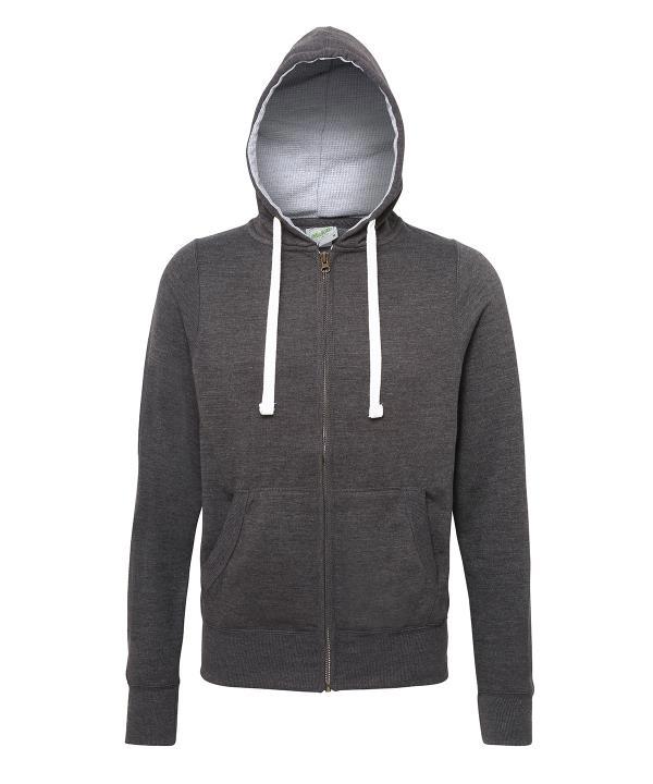 - Full zip hoodie.,Side panels for stylish fit.,Brass zip covered with chunky rib detail.,Overlock stitching detail throughout.,Double fabric hood with heather grey waffle fabric inner.