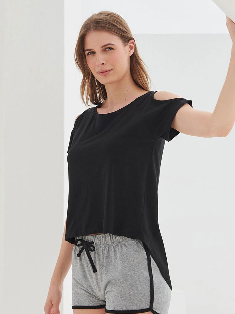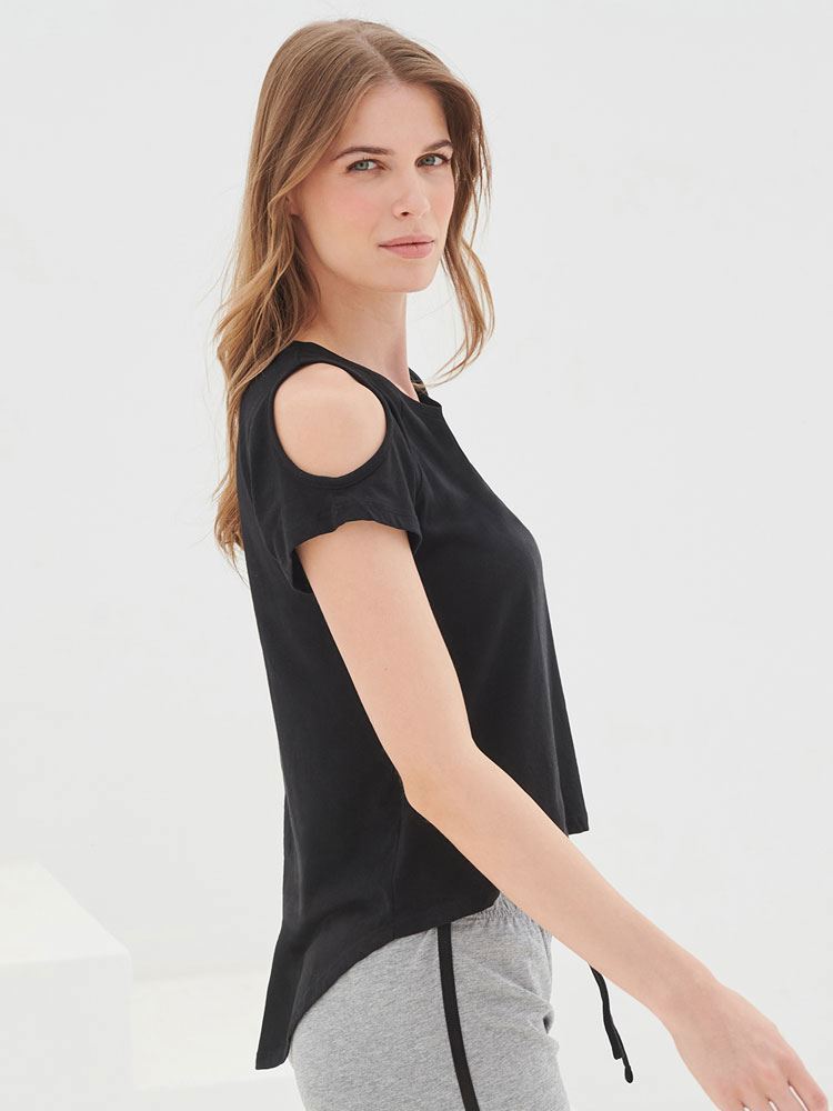 - Short sleeve raglan t-shirt with cut-out shoulders and drop tail