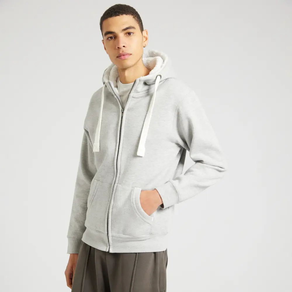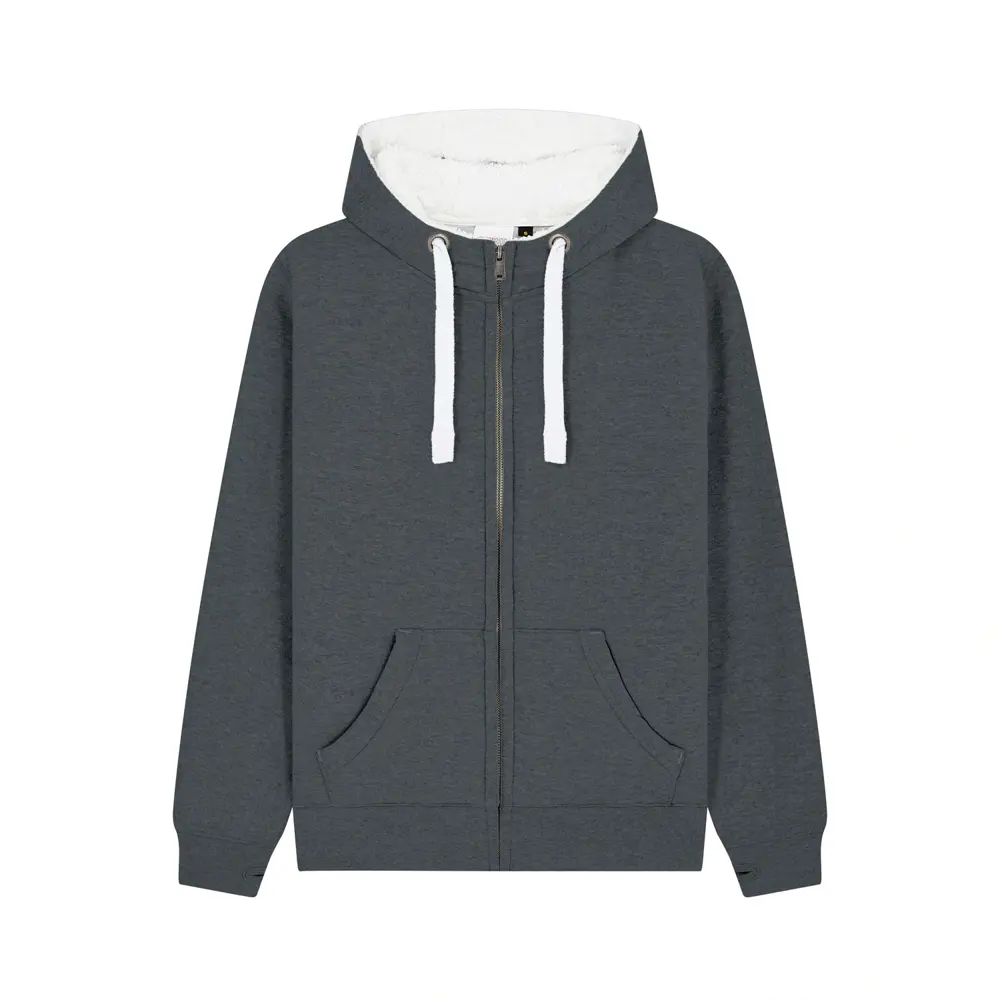 The F15 Sherpa Fleece Zip Hoodie offers a peach-finished touch, featuring a half sherpa lining in the hood and front panel for all-year comfort. It's a unisex garment with high neck styling, includes phone pockets in the pouch, and thumb holes in the cuffs for added convenience and warmth.
